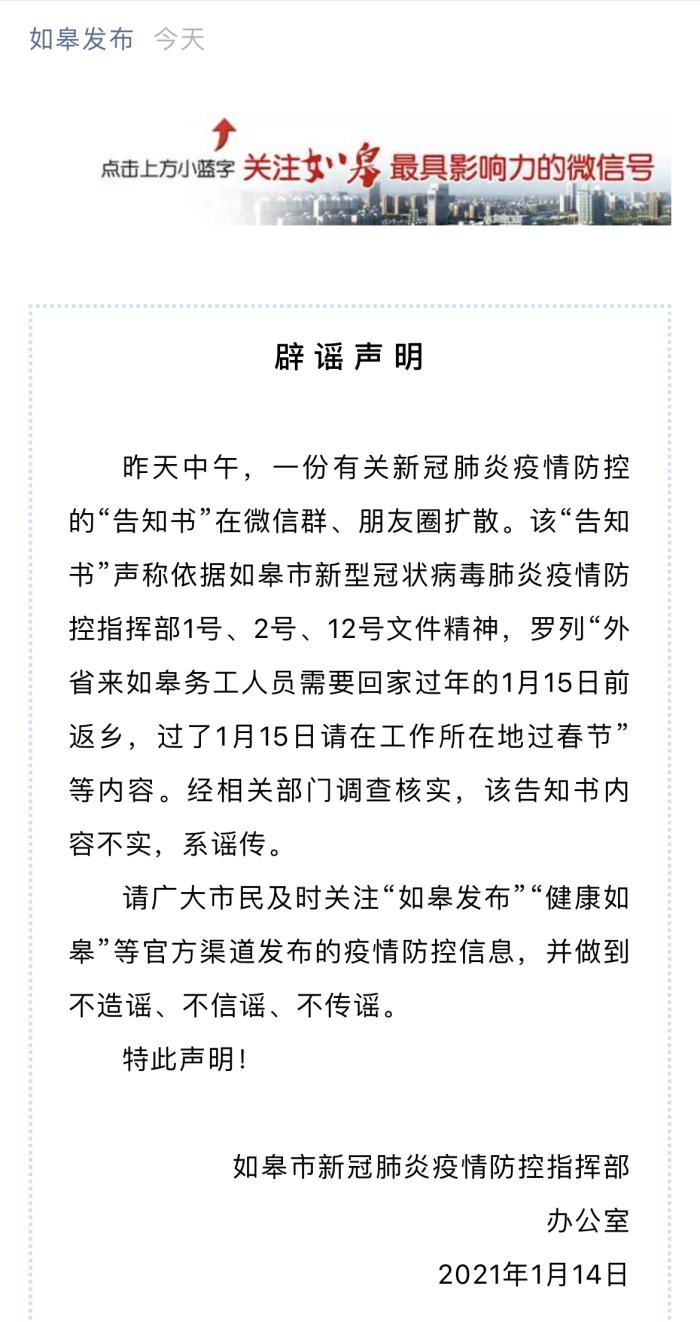 1月14日,据江苏如皋发布消息:昨天(13日)中午,一份有关新冠肺炎疫情防控的“告知书”在微信群、朋友圈扩散。该“告知书”声称依据如皋市新型冠状病毒肺炎疫情防控指挥部1号、2号、12号文件精神,罗列“外省来如皋务工人员需要回家过年的1月15日前返乡,过了1月15日请在工作所在地过春节”等内容。经相关部门调查核实,该告知书内容不实,系谣传。